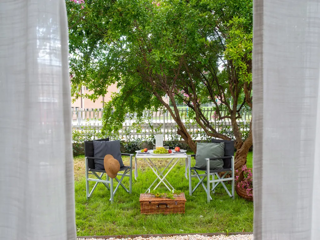 On the upper floor, a spacious terrace, furnished for the shared pleasure of the guests, provides a delightful and welcoming space. On the ground floor, surrounded by the greenery of trees, you can enjoy a quiet moment sipping a glass of Prosecco in the garden. The gentle outdoor lighting gives the house a charming atmosphere even in the evening hours.