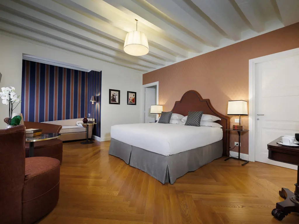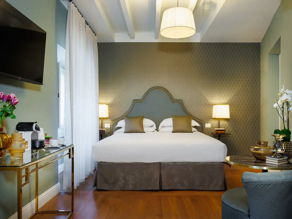 Le nostre camere sono state progettate con grande cura e attenzione ai dettagli, per offrirvi un'esperienza indimenticabile. Sono dotate di ogni comfort moderno, come aria condizionata, TV a schermo piatto con canali satellitari, minibar con bottiglie di acqua omaggio e macchina Nespresso con capsule. Il bagno è finemente decorato e offre un ricco set di cortesia. Potrete rilassarvi nella comodità dei nostri letti King size L 180cm, dotati di materassi ortopedici, lenzuola di cotone satinato e piumini ipoallergenici. Ogni camera offre dei piccoli angoli relax dove poter leggere, consultare qualche guida e sorseggiare un caffè o una tisana, gentilmente messi a disposizione dei nostri ospiti.